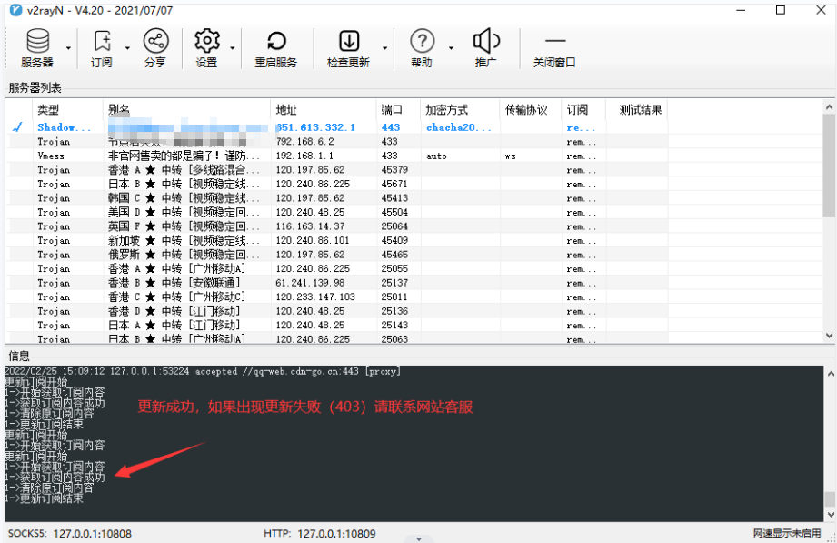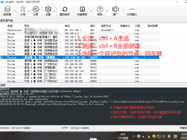 > ## 免责声明 > 请遵守法律法规,本网站所提供的信息,只供学习参考之用。严禁用作其他用途,您需对自己的自主行为和决定负责。 凡以任何方式登录本网站或直接、间接使用本网站资料者,视为自愿接受本网站声明的约束。。 ## 第一步、打开2018云官网注册账号购买订阅套餐 ### 高速稳定不卡顿节点:[官网推荐--[点击注册2018云](https://www.2019yun.cc/#/register "点击注册2018云")] ## <font color="#DC143C">保存2018云导航页永不失联: www.2018yun.cc</font>  ### ==已购买套餐的忽略注册账号步骤== ## 第二步、下载v2ray电脑端软件 ## [👉 点我下载v2ray👈](https://app.ali-any.com/pcv2-Core.zip) ## 第三步、打开下载好的软件压缩包,解压到C盘或桌面  ### 1.鼠标右键发送快捷方式到桌面  ### 2.双击打开V2ray软件  ### 3.点击设置---参数设置---跳过证书验证   ## 第四步、打开2018云加速官网获取二维码 ## 1.打开2018云加速官网:https://www.2019yun.cc ==复制官网地址到浏览器打开== ### 2.登录购买的卡密账号  ### 3.点击仪表盘--一键订阅---扫描二维码订阅    ## 第五步、打开v2软件,点击服务器,选择扫描屏幕二维码导入   ### 1.以上步骤操作完之后再点击订阅,然后点击更新订阅不通过代理  ### 2.更新出来线路后  ## 3.(全选线路Ctrl键+A)--全部测速(Ctrl键+R)---选择一个低延迟的线路回车键  ### 4.在电脑右下角软件v2ray中,鼠标右键,点击系统代理,自动配置系统代理(开启加速),任务栏图标变成红色的,即代表已成功联网  ## 开启加速就可以访问外网了 > ## 软件开启关闭 > ### 开启:系统代理--自动配置系统代理 > ### 关闭:系统代理--清除系统代理 ## <a href="../../project-2/" targert="_blank">👉返回教程首页目录</a>